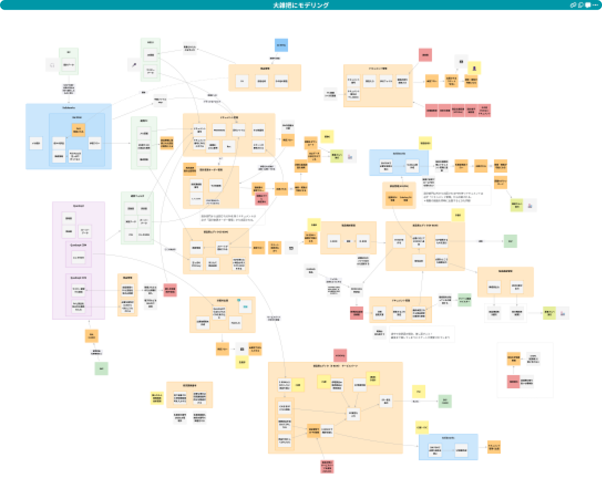 モデリングでは色分けを活用しました。基幹システムでやることをオレンジ色、別のシステム(CAD、連携PC等)でやる作業を緑色、アウトプット(書類やファイル)を青色、実際のアクションを紫色、実際に使う人(社内のどのグループか)を黄色として整理しました。